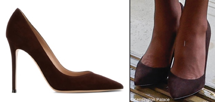 The Princess brought back her Gianvito 105 pumps in ‘chocolate’ suede, the brand’s point-toe style with a spike heel. It is available at Farfetch ($795),