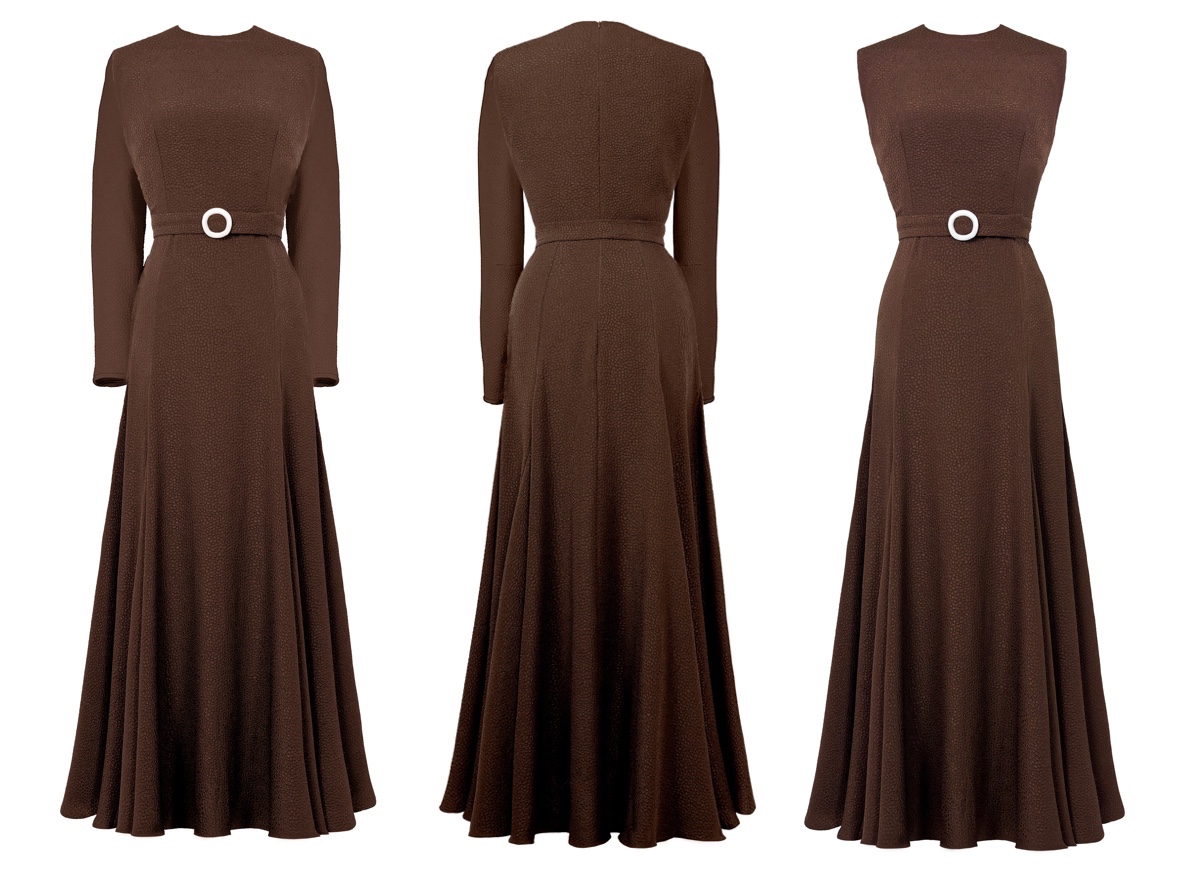 The Princess appears to be wearing a new Edeline Lee dress, the brand’s Jete Crop Dress ($2080) in ‘Flou Bubble Jacquard,’ a style made in England in fabric manufactured in Italy from the A/W 2025 collection. The dress is snug through the bodice, waist, and hips before flaring into a full skirt, one of the Princess’s favorite silhouettes. It is made of polyester with a touch of elastane and features a round neckline, a hidden back zipper, and a self-belt; the Princess’s buckle is also covered in fabric to match the dress.