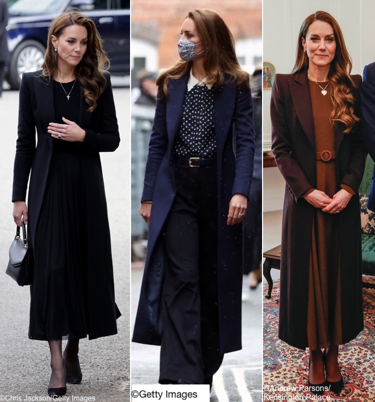 Her coat looks like a bespoke Catherine Walker design, much like the one she has also worn in black and navy.